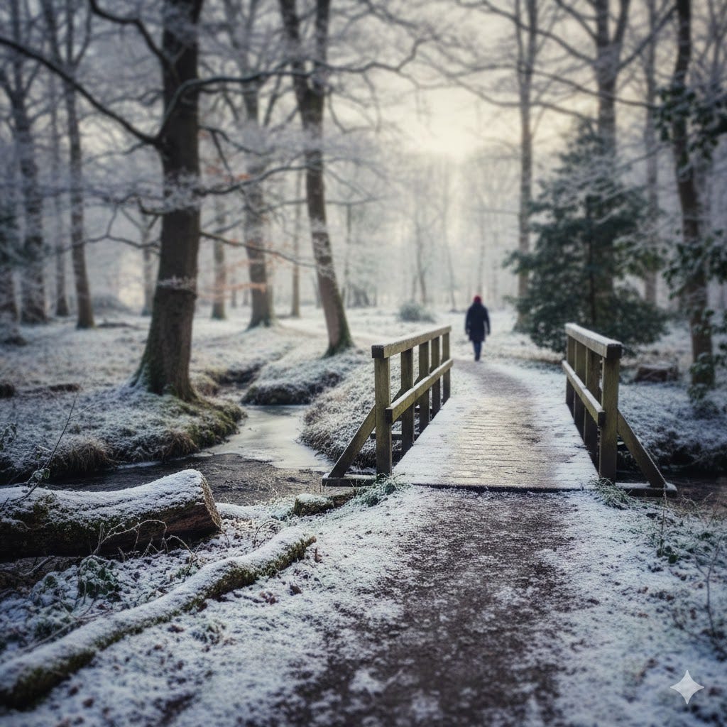 The year has set its roots, and finally, the white arrives— a thin, lace smattering of snow upon the English wood. The bridge is slick, the hill is glass, a cold reminder of the ancient rhythm: that winter was born for rest, for the long sleep, the quiet mend, before the green fire of the spring.